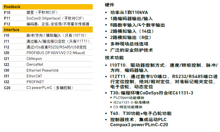 Compax3驅(qū)動器為智能伺服驅(qū)動器,適用于伺服電機,異步電動機,直驅(qū)電機,特點包括:絕對反饋,110/230 VAC,400/460 VAC,單軸技術(shù),多軸技術(shù),現(xiàn)場總線連接,Ethernet通訊,標準安全防護(STO),高級安全防護,IEC 61131-3編程,應(yīng)用宏。