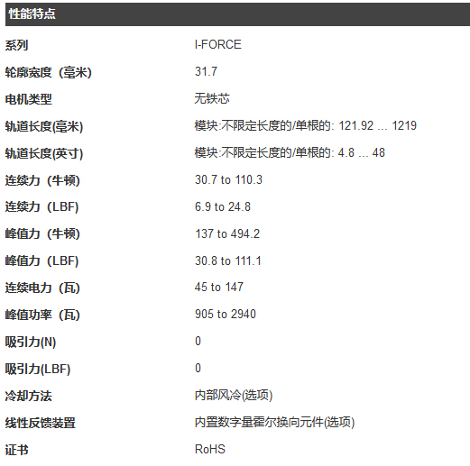 派克 I-Force 210 無鐵芯直線電機 相對于緊湊的體積提供高推力和急加速的能力. 持續(xù)推力范圍 30.7 N (6.9 lbf) to 110 N (24.8 lbf) ,峰值推力范圍 137 N (30.8 lbf) up to 494 N (111 lbf),  在I-Force系列提供極佳的性能和尺寸組合。專利的工字型骨架和重疊的繞組設(shè)計提高了電機的功率密度,改善了散熱,以及附加的結(jié)構(gòu)剛度。此外,無鐵心(或空氣芯)直線電機繞組與磁軌之間沒有吸引力。這樣便于安裝和運動過程中的零齒槽效應(yīng)。I-Force系列配備了超高柔性電纜。此外,派克提供模塊化磁軌實現(xiàn)無長度限制的行程。令人難以置信的是平滑運行,高精度,高推力密度使I-Force系列直線電機成為要求苛刻的定位要求的理想解決方案。