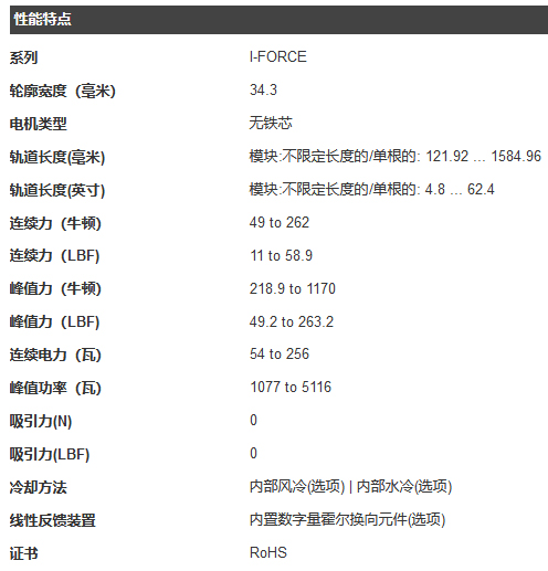 I-Force 310 無鐵芯直線電機(jī)峰值推力可達(dá) 1170N, 卓越的加速度和緊湊的體積. 34.3mm 寬的無鐵芯設(shè)計(jì)具有零齒槽效應(yīng)力,同時(shí)工字型骨架繞組提供很高的推力/體積密度比和優(yōu)越的散熱效果