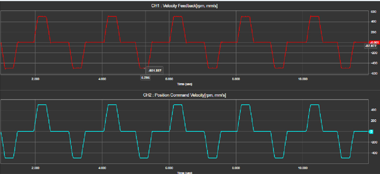 Parker直線電機(jī)軟件操作簡(jiǎn)單,容易掌握,可實(shí)時(shí)監(jiān)測(cè)電機(jī)的動(dòng)態(tài)---速度和位移反饋曲線如下圖